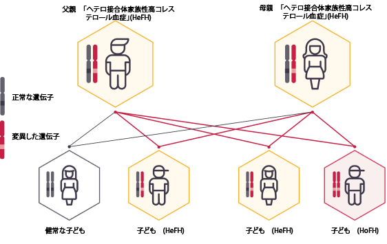 「ホモ接合体家族性高コレステロール血症」(HoFH)とは、両親から遺伝する希少疾患であり、「家族性高コレステロール血症」(FH)の原因となる遺伝子の対の遺伝子の変異が2つ(それぞれの親から1つずつ)受け継がれることで発生します。すなわちそれぞれの親は、一般的なヘテロ接合性家族性高コレステロール血症