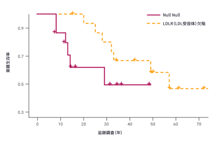 - 二重LDLR欠損型(null/null):全機能喪失をもたらす疾患関連変異が、両方の対立遺伝子に認められる