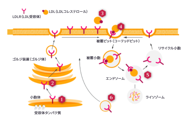 LDLの大部分は、肝臓の細胞膜上にあるLDLR(LDL受容体)によって血漿から除去されます。2